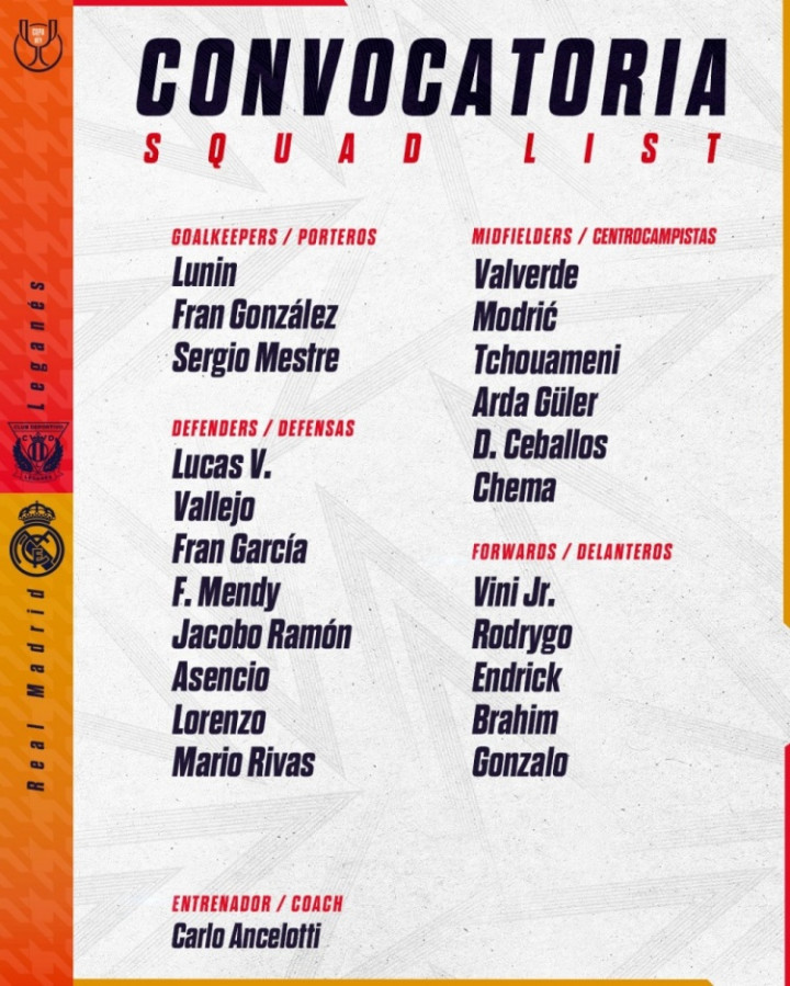 直播吧2月4日讯北京时代本周四凌晨4:00,皇马将在客场对阵莱加内斯。赛前,皇马官方公布了将出战本场比赛的大名单。其中,贝林厄姆、姆巴佩、阿拉巴等多名球员缺战。