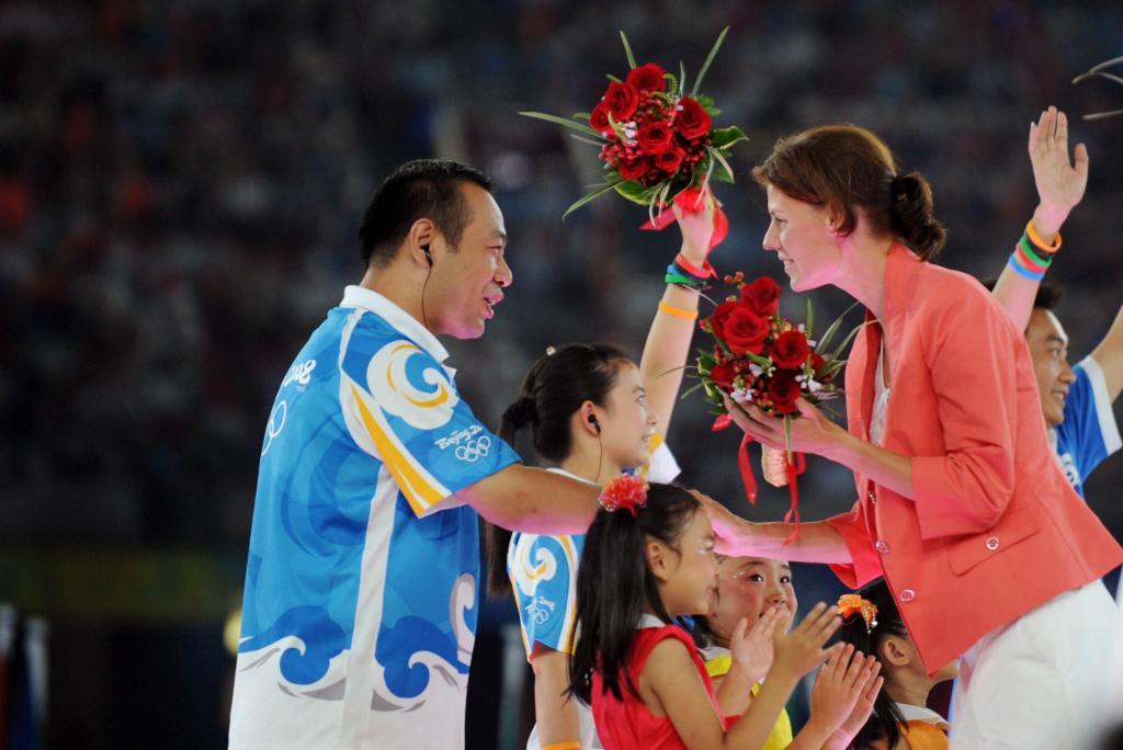 这是志愿者代表(左)在2008年北京奥运会完毕式上接收国际奥委会请示员委员会新委员的献花(2008年8月24日摄)。 新华社记者李尕摄
