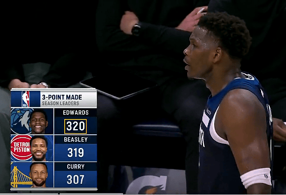 比赛的第四节体育集锦,爱德华兹45度接球三分掷中,掷中本赛季个东谈主第320个三分特别比斯利独占三分榜第一位。