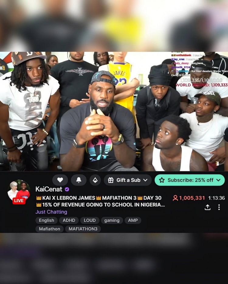据好意思国媒体Complex报说念,詹姆斯的亮相为这场直播带来了雄伟热心度,直播岑岭不雅看东说念主数跨越了100万东说念主。Kai Cenat由此齐全了直播生活初次100万在线不雅看东说念主数,突破了此前最高约72万不雅世东说念主数的记录。